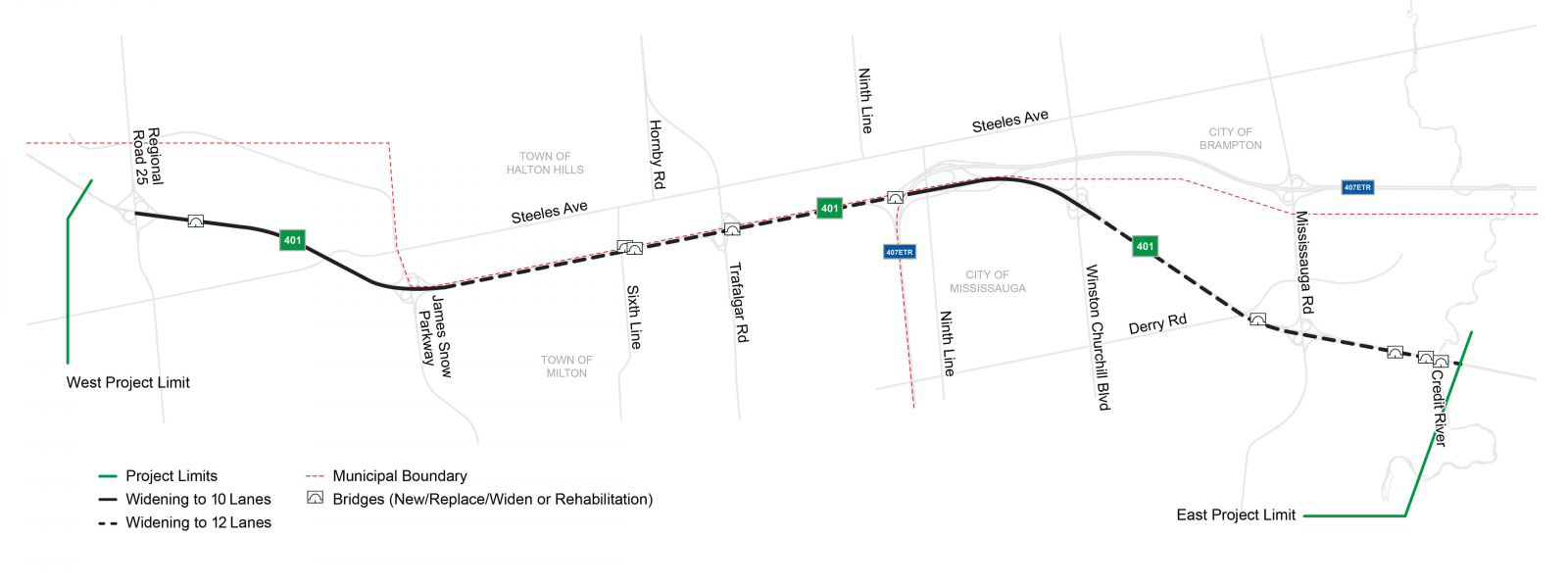 - 10 lanes from Winston Churchill Boulevard to the Highway 407 ETR/Highway 401 interchange